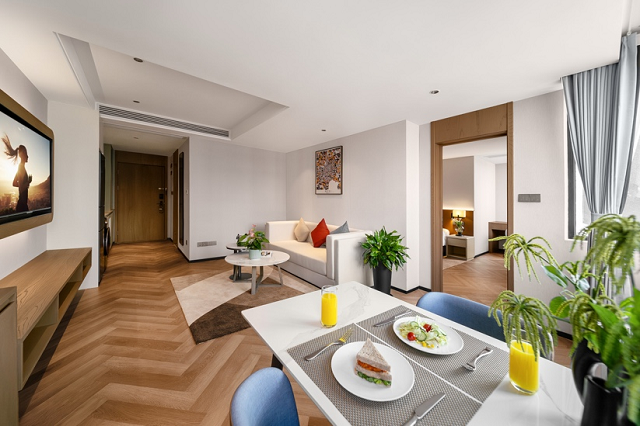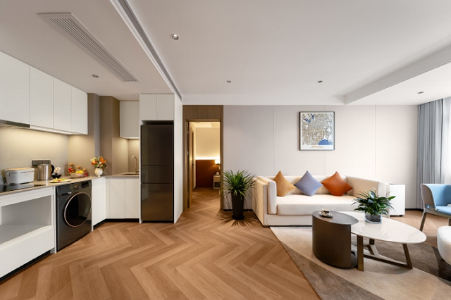 酒店拥有182间舒适客房,从精致的35㎡豪华单房公寓到宽敞的90㎡两居室套房,多元户型可满足不同住客的居住需求。所有房型均以“简约轻奢+在地文化”为设计核心,巧妙融合合肥城市特色与现代居住美学,配备智能家电及高品质生活配置。多数房型更增设独立厨房、嵌入式洗烘一体机,通过细节设计彰显质感与温度,为住客营造温馨惬意的居住环境。
